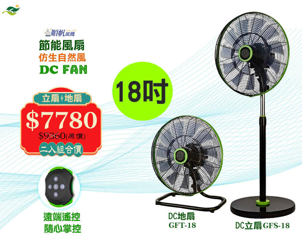 特惠限量二入組合價[順帆]18吋DC節能廣角遙控立扇+地扇