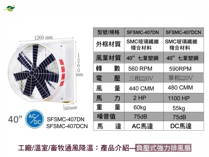 40"七葉塑鋼扇葉 / 直接式 SFSMC-407DN [AC馬達] ‧百葉片耐寒,抗紫外線 ‧外殼採用FRP玻璃鋼纖維一體成型 ‧可排熱氣粉塵,增加空氣對流循環 SFSMC-407DCN [DC馬達] ‧DC無刷馬達:節能、環保、可節省電能30~50% ‧過載電流/ 電壓保護裝置